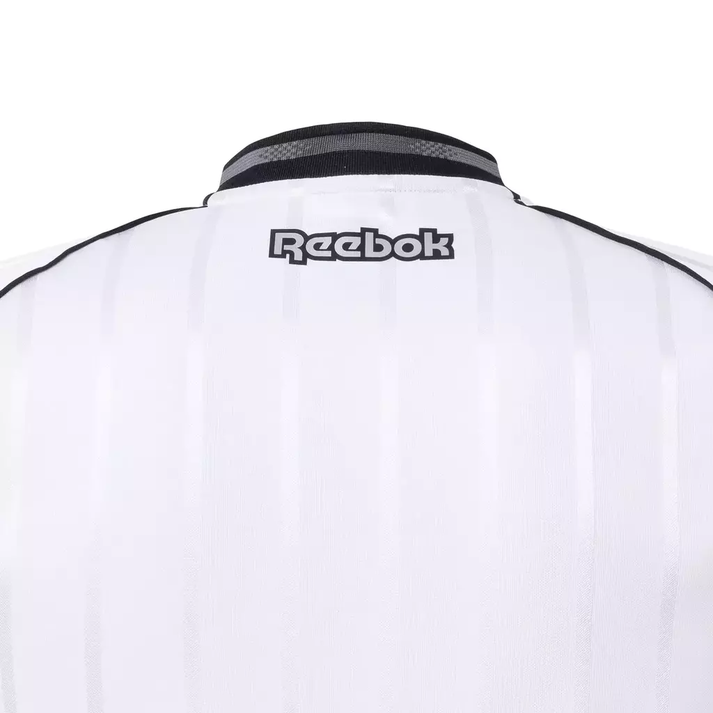 - Logo Reebok centralizado abaixo da gola V preta, símbolo forte da identidade Aura 90.